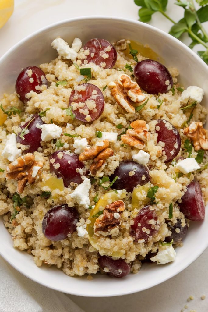 This salad is a sweet and savory delight. Combine cooked quinoa with halved grapes, chopped walnuts, crumbled goat cheese, and a lemon vinaigrette. This salad is a perfect balance of flavors and textures.