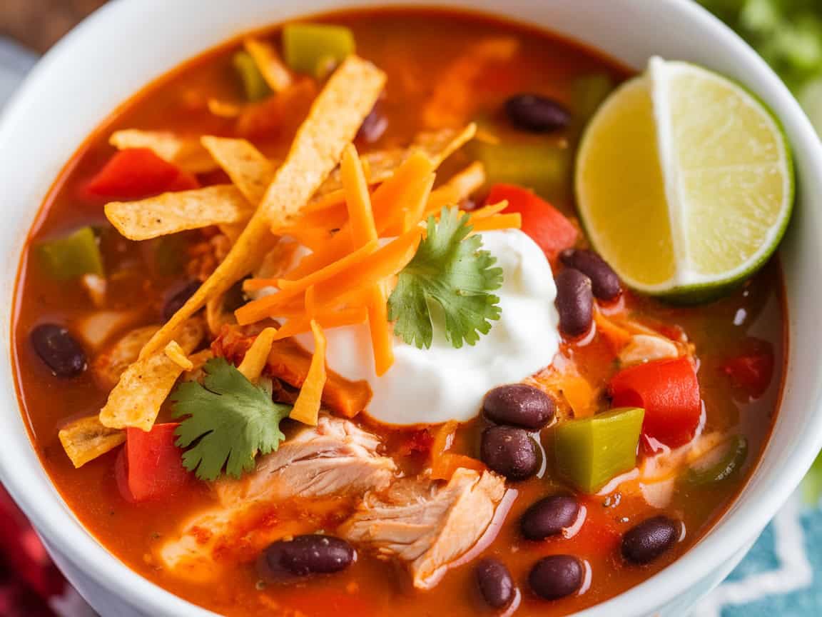 When you’re ready to serve, ladle the soup into bowls and load up each serving with crisp tortilla strips, a sprinkle of shredded cheddar, a dollop of sour cream, and a scatter of fresh cilantro. A squeeze of lime juice brightens it all up, adding that extra zing.