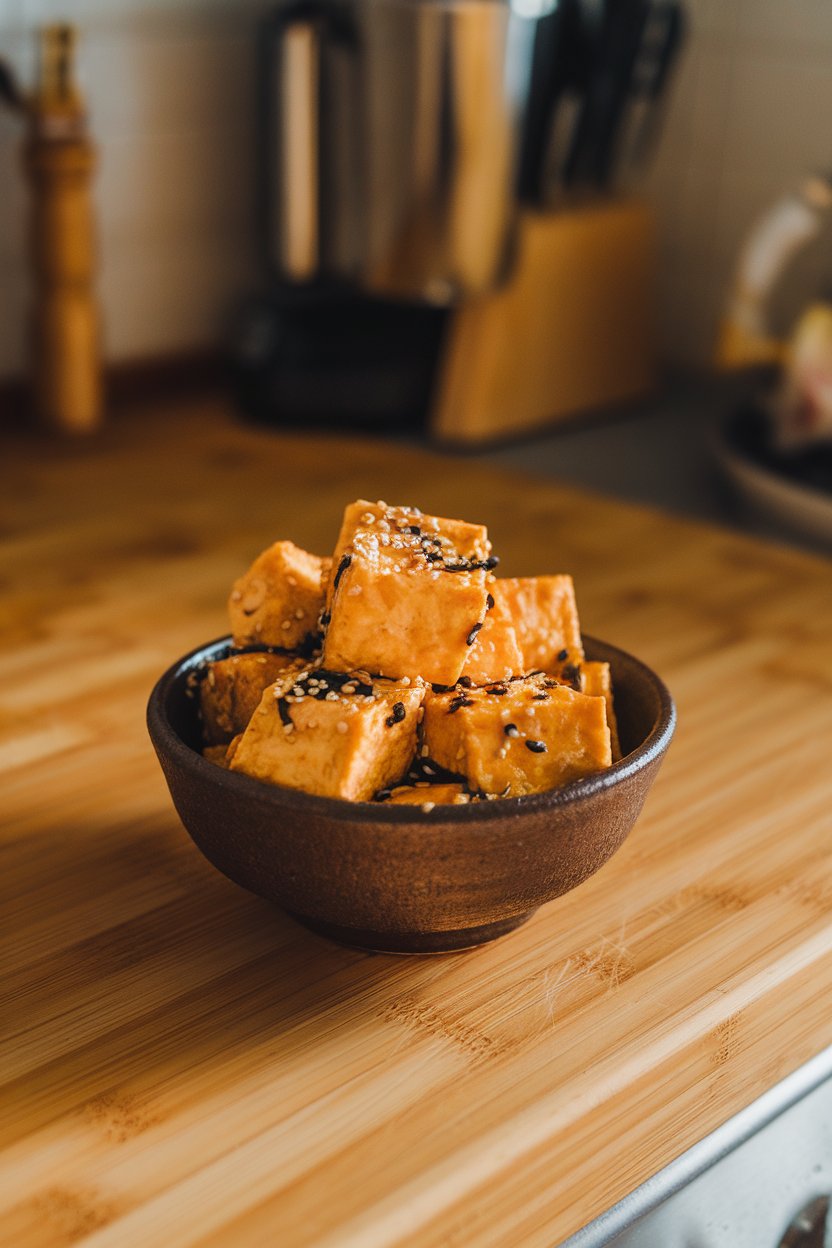 Stir gochujang paste with rice syrup and a touch of soy for balance. Brush onto tofu halfway through cooking so it caramelizes without burning. A final dusting of toasted sesame seeds adds crunch. Serve with kimchi and steamed greens for a quick Korean-inspired bowl.
