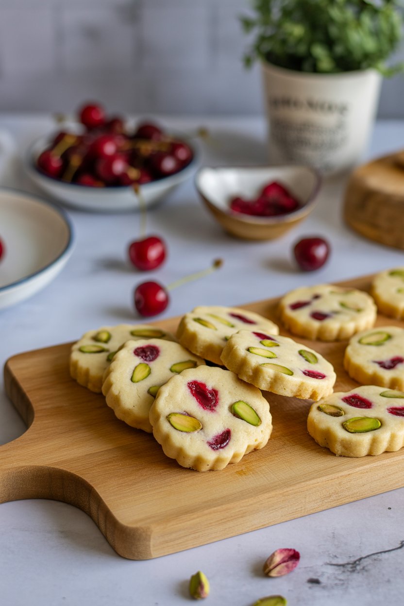 Bright candied cherries and toasted pistachios create built-in holiday color. Form the dough into logs, chill, then slice and bake as needed. Their neat edges and speckled look make them presentation-ready. They’re sturdy enough for shipping long distances.