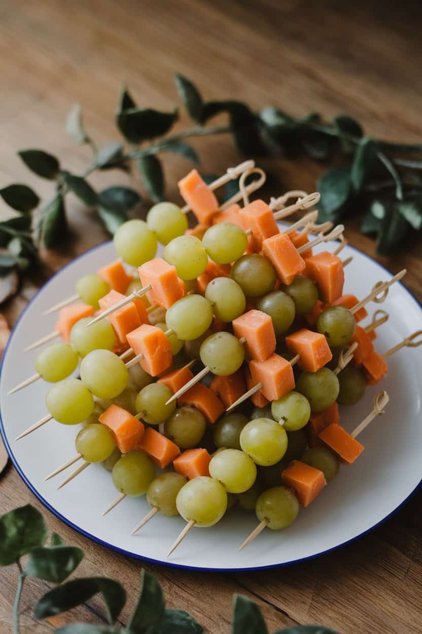 Pairing fruit with cheese on mini skewers offers the sweet-salty bite people love. Cheddar blocks are cheaper than many cheeses and easy to cube. Threading grapes between the cubes adds a pop of color and freshness. Arrange the skewers in concentric circles for visual appeal without fancy props.