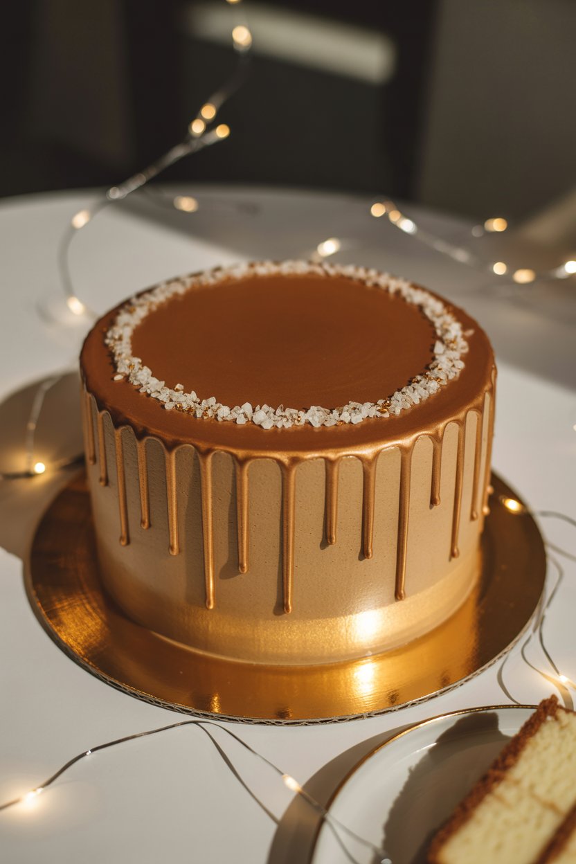 Brown sugar sponge layers hide gooey caramel pockets. Edible gold paint mixed into the drip turns each rivulet festive. A final pinch of flaky salt keeps the sweetness in check.