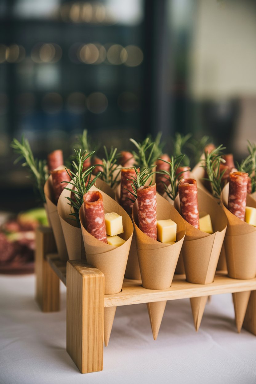 Portable cones make mingling easier than hovering over a table. Fill them with rolled meats, cheese cubes, and even a few nuts for variety. Arrange the cones upright in a festive stand so they double as décor.