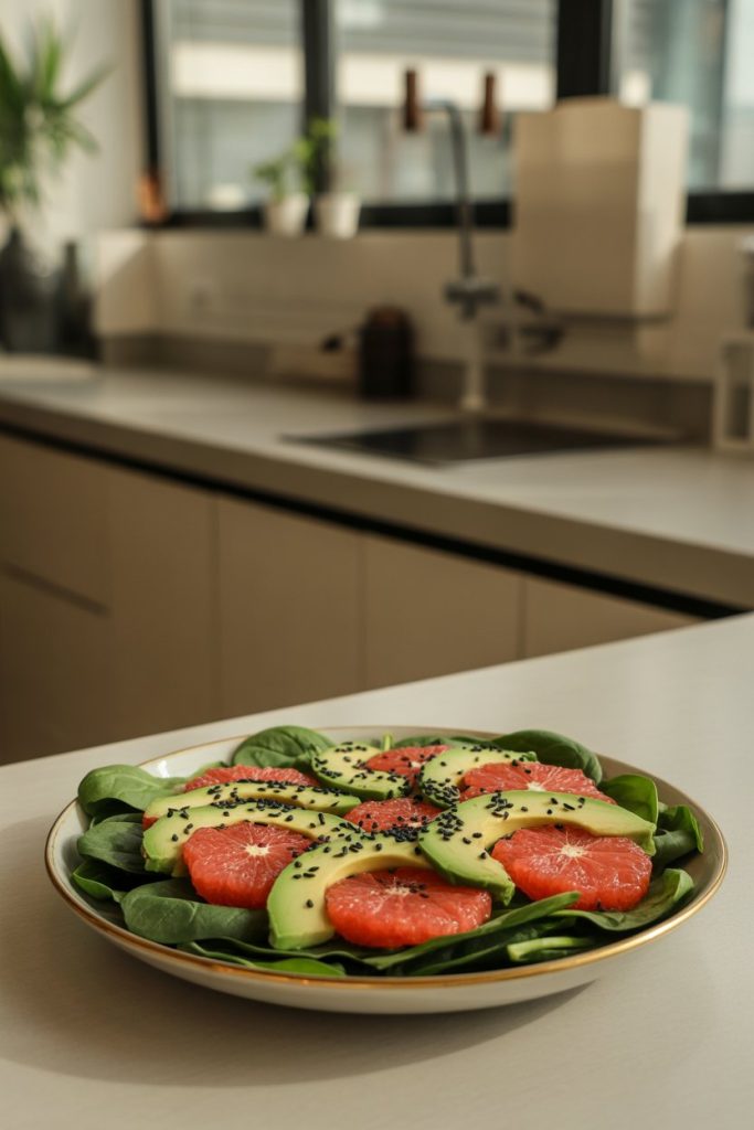 Velvety avocado balances the tartness of grapefruit segments. Black sesame seeds add dramatic contrast and gentle crunch. Spinach leaves provide a mild backdrop that lets the duo shine. A light honey-ginger dressing rounds out the flavors.