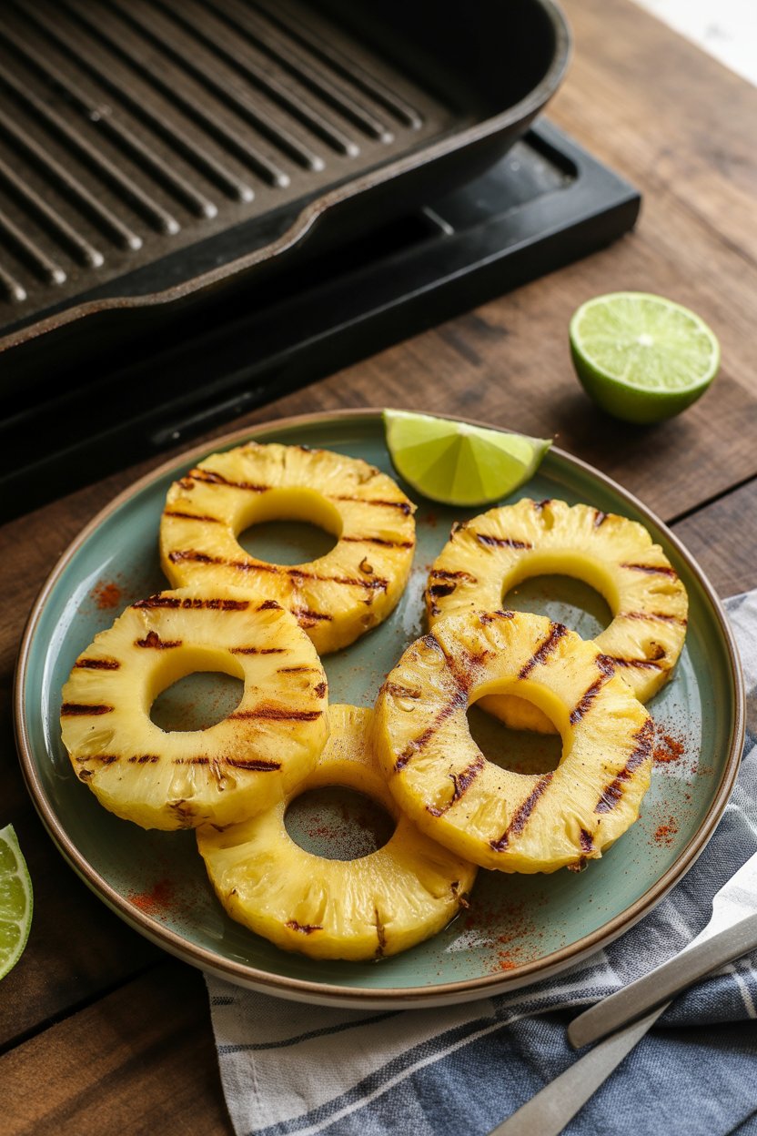 Caramelized pineapple gains smoky edges on an indoor grill pan. Chili powder provides gentle heat, while lime zest brightens sweetness. Serve warm beside jerk-spiced proteins.