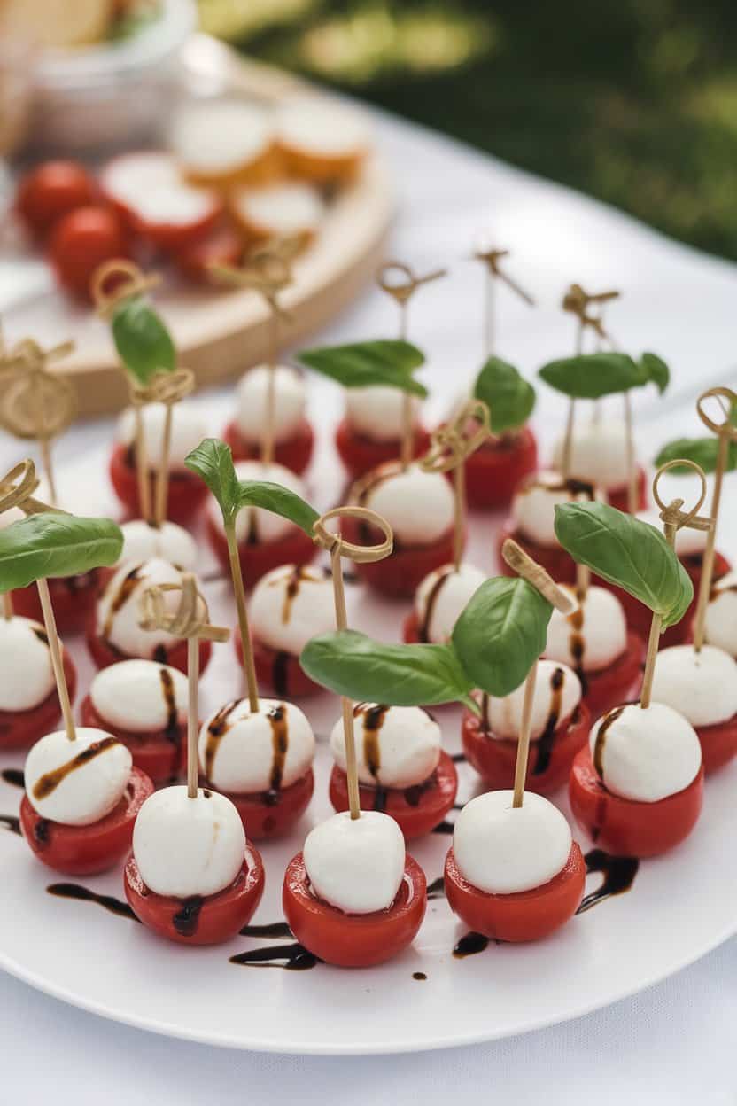 Think of these as Caprese salad made picnic-friendly. Stack a basil leaf, a mozzarella pearl, and a cherry tomato on a party skewer, then chill until ready to serve. A quick balsamic drizzle just before packing adds sweet tang without making anything soggy. They’re bite-sized, colorful, and pair with nearly every other picnic food on this list.