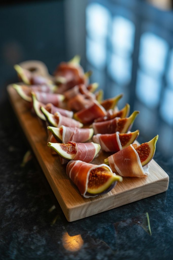 Halve dried figs lengthwise and wrap each with a ribbon of prosciutto. Chill so they hold shape. Sweet, salty, and a little eerie.