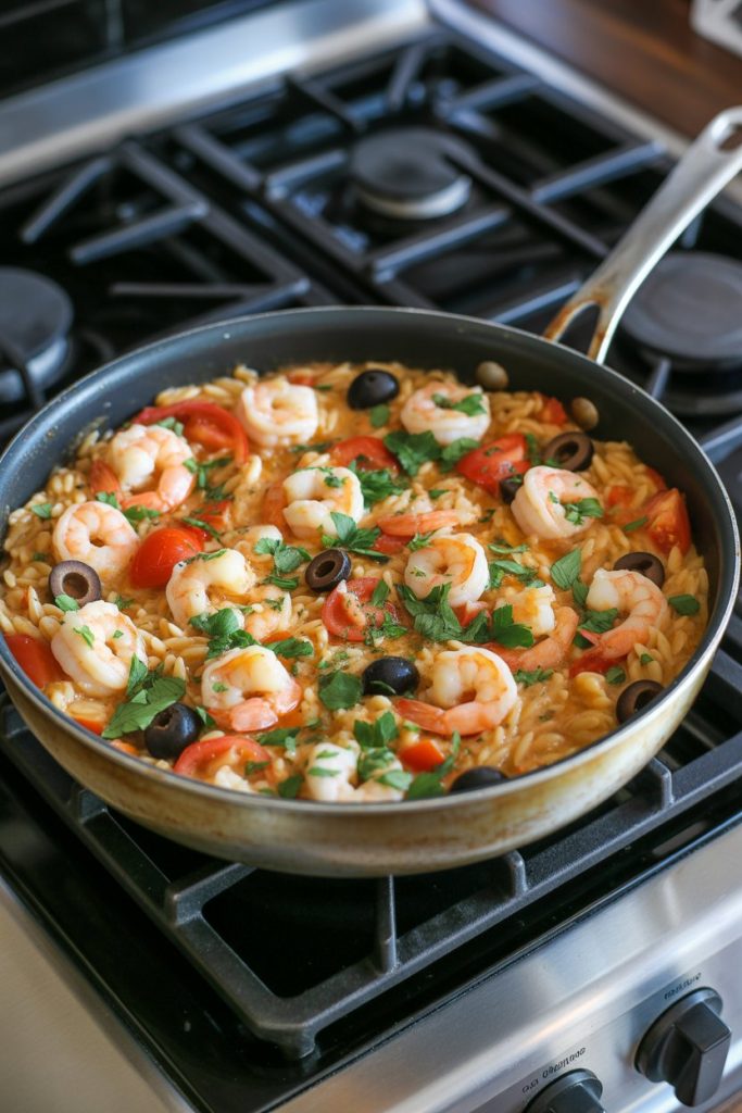 Sauté shrimp lightly, then remove and cook orzo in the same pan with broth and tomatoes. Stir shrimp back in at the end with olives and herbs. Everything cooks in under 30 minutes with minimal mess.