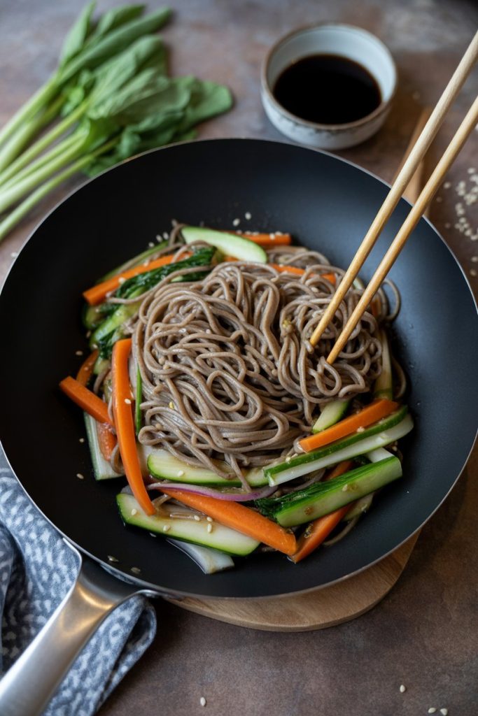 Whisk white miso, fresh ginger, and rice vinegar for a quick dressing. Toss with buckwheat soba, edamame, and thinly sliced veggies. Serve warm or chilled for versatile dining.