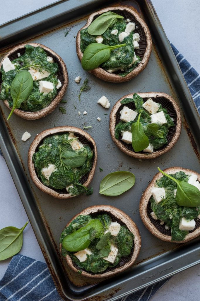 Large mushroom caps replace pastry or dough, cutting carbs while adding umami. The spinach-feta mixture bakes until bubbly and golden. Serve two caps per person with a side salad.