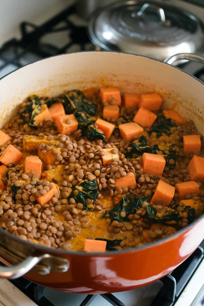 Red lentils cook down quickly, thickening the sauce without extra starch. Cubes of sweet potato add natural sweetness that balances curry spices and coconut milk. Serve over basmati rice for a plant-based dinner that satisfies even meat-lovers.