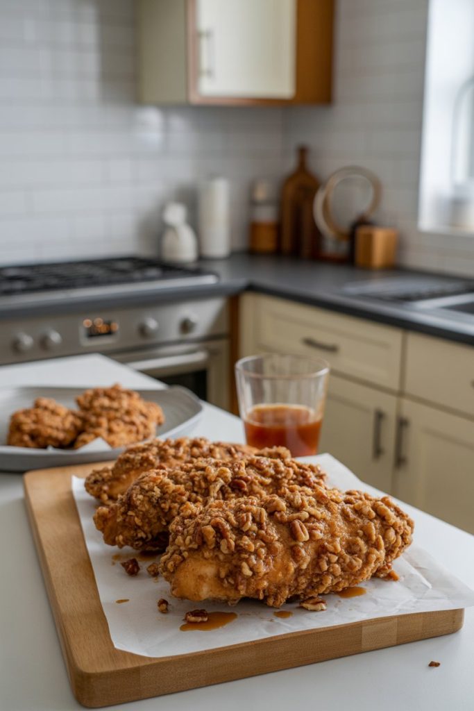 Finely chopped pecans lend a buttery flavor and hearty crunch that stands up to frying. Mix them with seasoned flour so the nuts form an even layer. The high oil temperature quickly toasts the pecans, deepening their richness. A light maple drizzle complements the nutty taste.