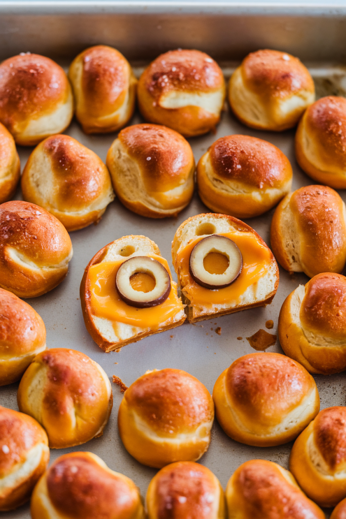 Soft pretzel dough hides gooey cheese that oozes slightly after baking. An olive slice pressed on top before the bake becomes a creepy pupil. Serve with honey mustard for dipping.