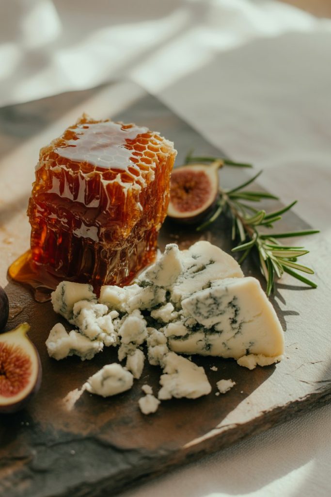 Deep blues and golden honey create a mystical color pairing. Smear cheese onto crackers and top with sticky honey for contrast. Rosemary sprigs perfume the board without overwhelming flavors.