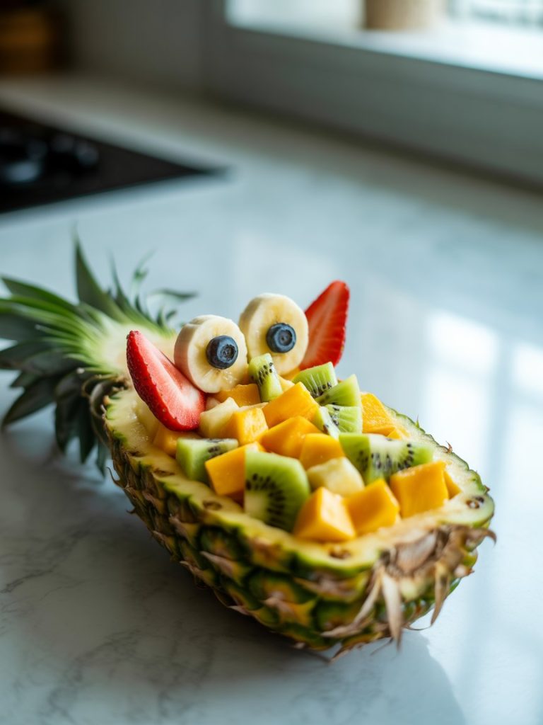 Carve a pineapple lengthwise and scoop out the flesh to dice. Refill the shell with the fruit mix, then craft large eyes from banana rounds topped with blueberries. Strawberry halves angled outward create wings for a wise woodland guardian.