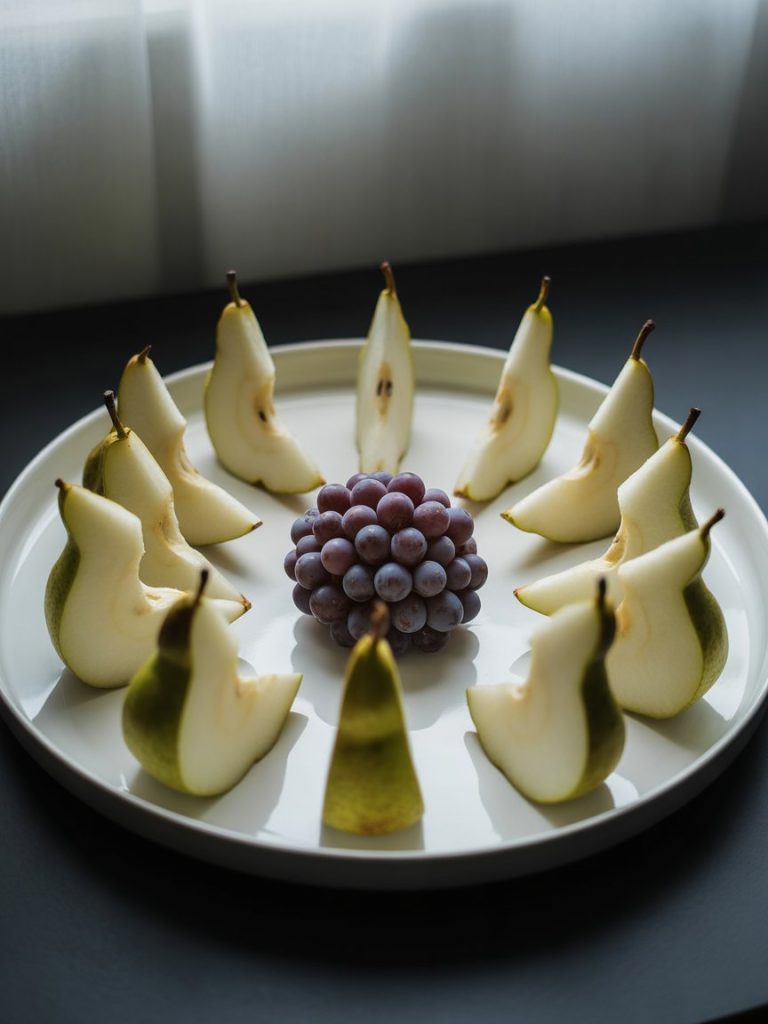 Halve pears lengthwise and carve small ear points at the top. Place them vertically with narrow ends upward, then position a round purple grape above as the moon. Cinnamon dust adds subtle rugged color.