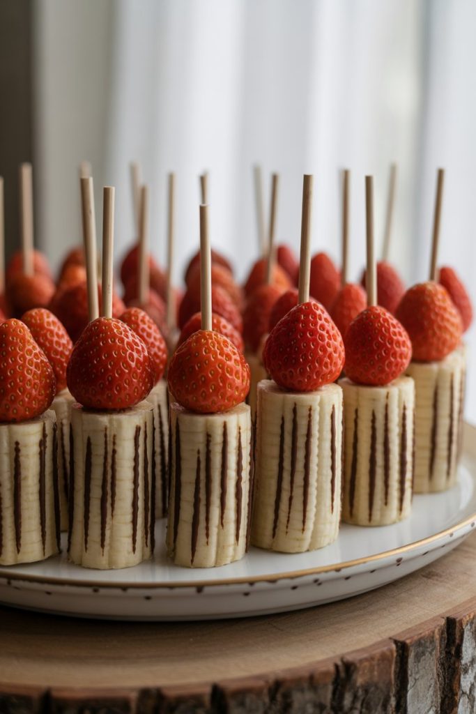 Cut bananas in half lengthwise and insert wooden skewers. Score gentle lines down the length to mimic wood grain. Cap each with a hulled strawberry pointing outward so the red berry looks like broom bristles.