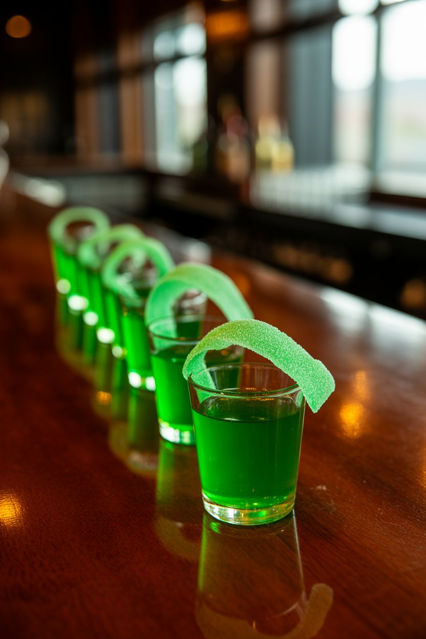 Lime gelatin mixed with citrus vodka creates a neon base that screams slime. Let the cups set halfway, slide a gummy worm in at an angle, then finish filling. Kids at heart will love fishing out the candy before tossing back the shot.