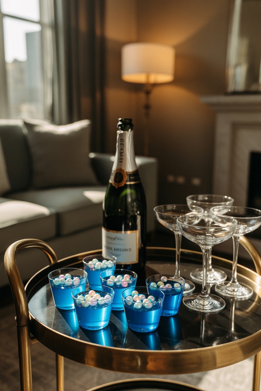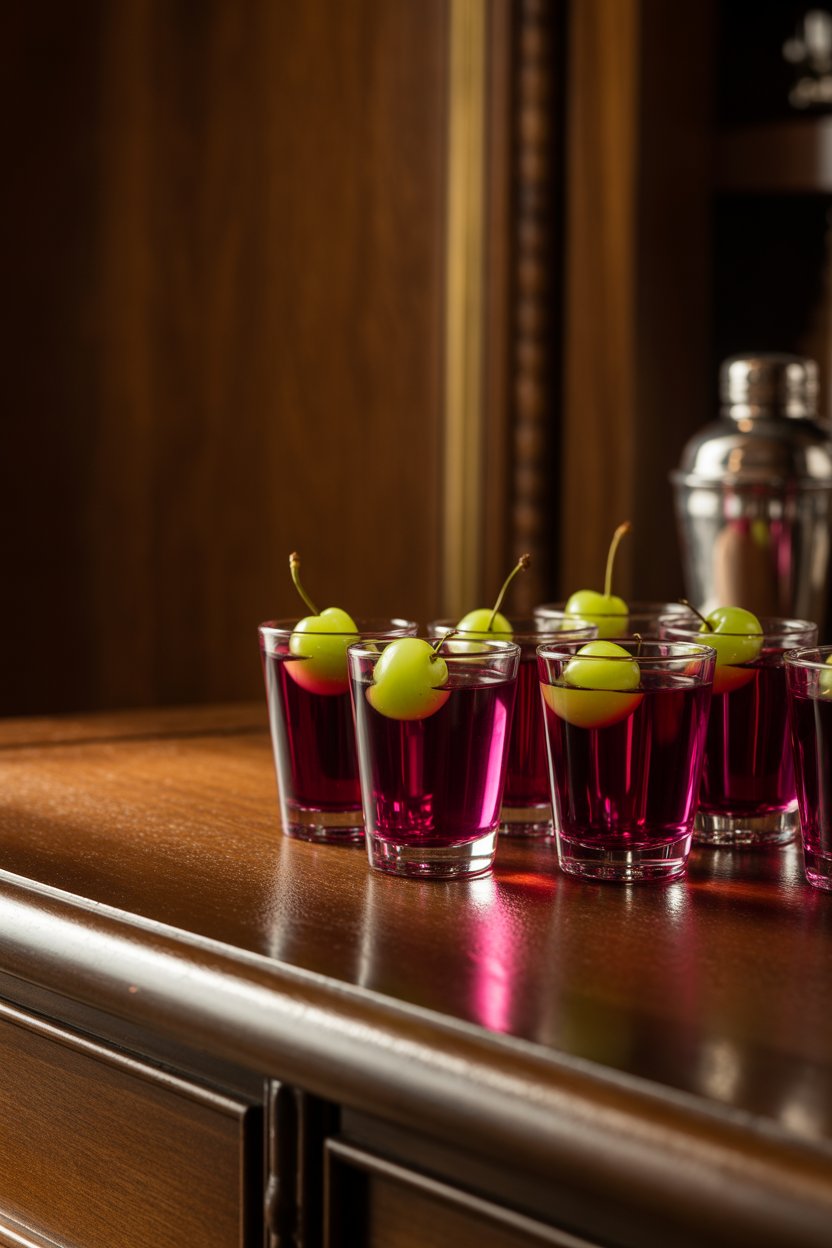Pomegranate juice, vodka, and gelatin produce a jewel-tone hue. Drop a handful of pomegranate arils in each cup to mimic suspended red pearls. The tangy juice balances the spirit’s warmth.
