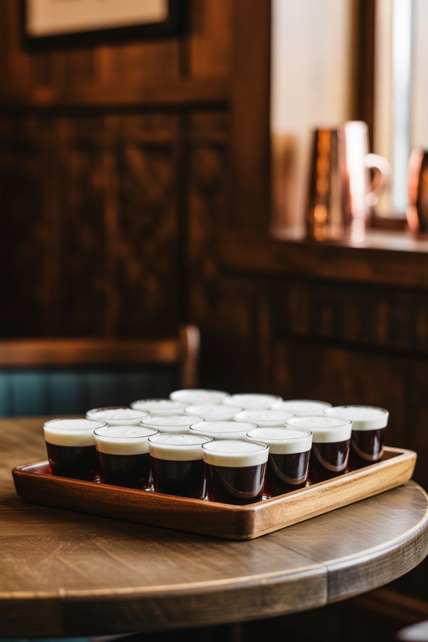 Set Mexican dark lager with gelatin for malty depth. Combine gelatin with lime-salt mixture separately for a thin white cap. The duo looks like mini pints ready for a séance.