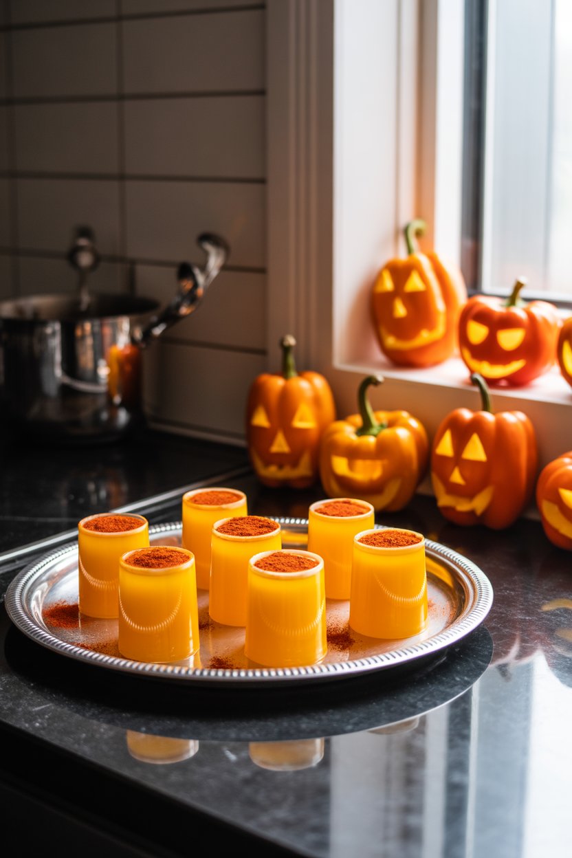 Mango purée, unflavored gelatin, and tequila bring tropical heat. Rim each cup with tajín or chili-lime seasoning for zing. Carve mini jack-o’-lantern faces into baby bell peppers and perch on the tray as décor.