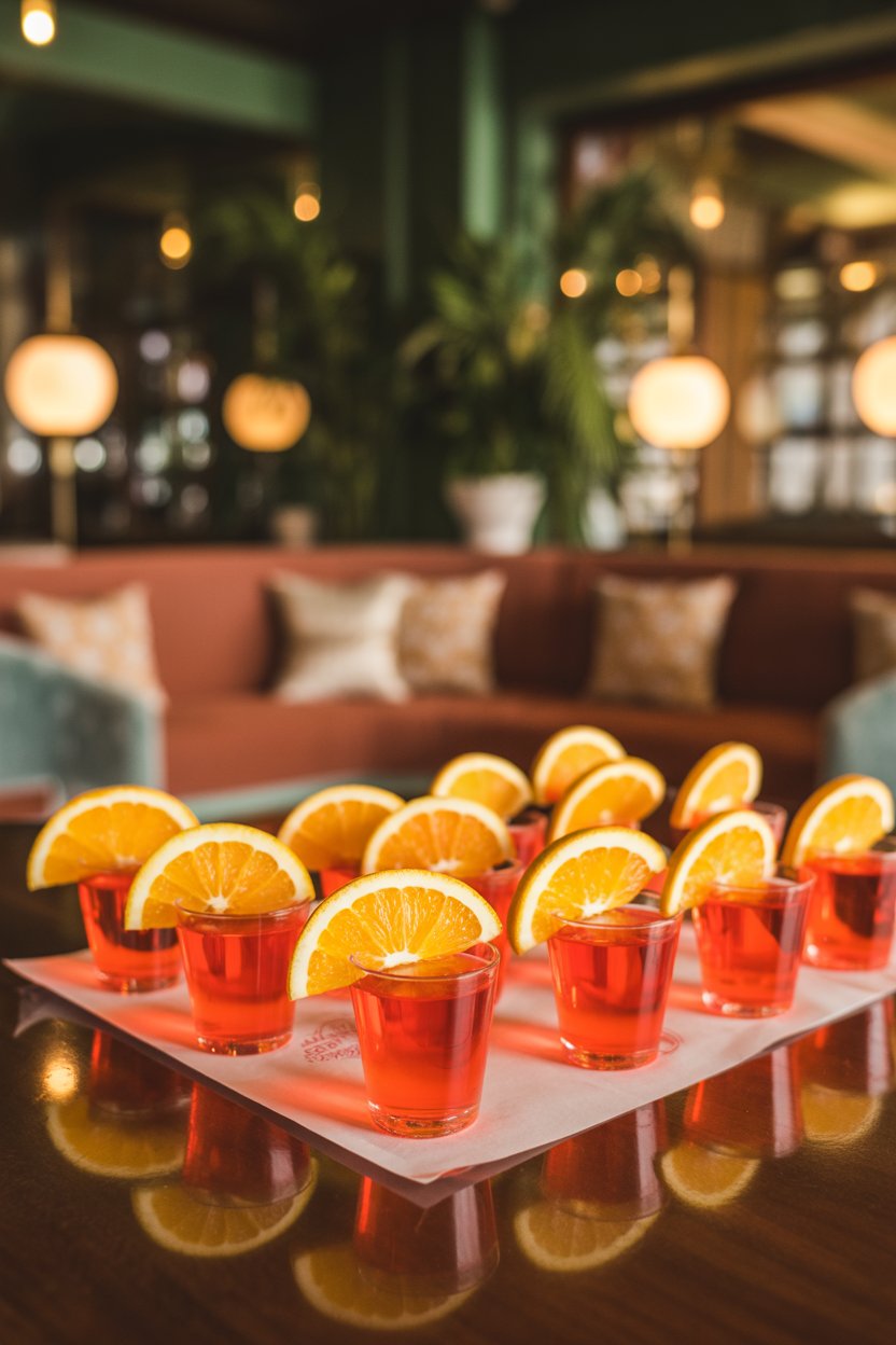Aperol, prosecco, and unflavored gelatin mingle for a bitter-sweet jello shot. Add just a splash of soda water before setting for subtle effervescence. The orange wedge hints at traditional spritz presentation.