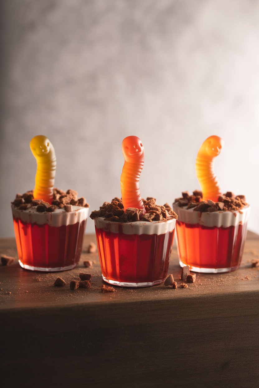 Chocolate pudding mix, Irish cream, and gelatin make a velvety “mud.” Sprinkle crushed chocolate cookies on top to resemble fresh soil. A single gummy worm completes the tiny graveyard look.
