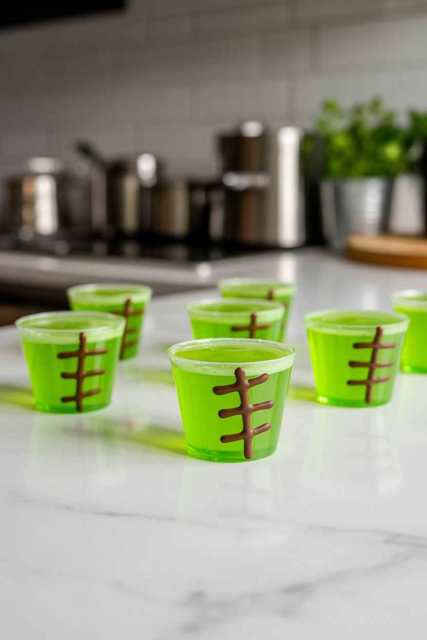 Kiwi purée, Midori, and unflavored gelatin create a fresh, bright green base. Drag a toothpick coated in chocolate syrup across the surface for stitch marks. Two mini chocolate chips serve as bolts on each side of the cup.