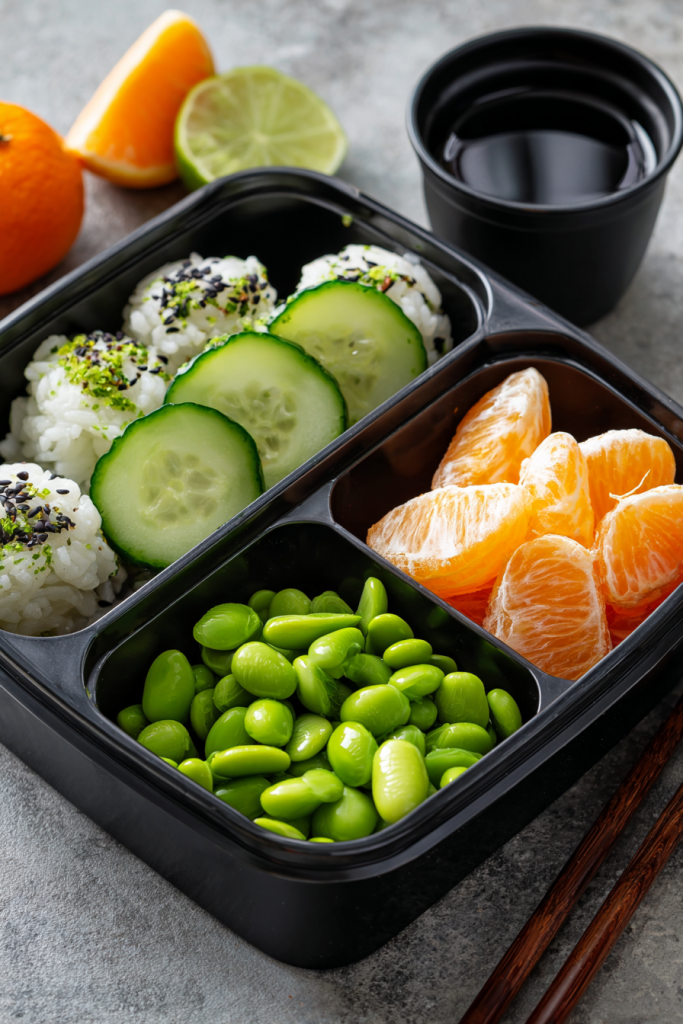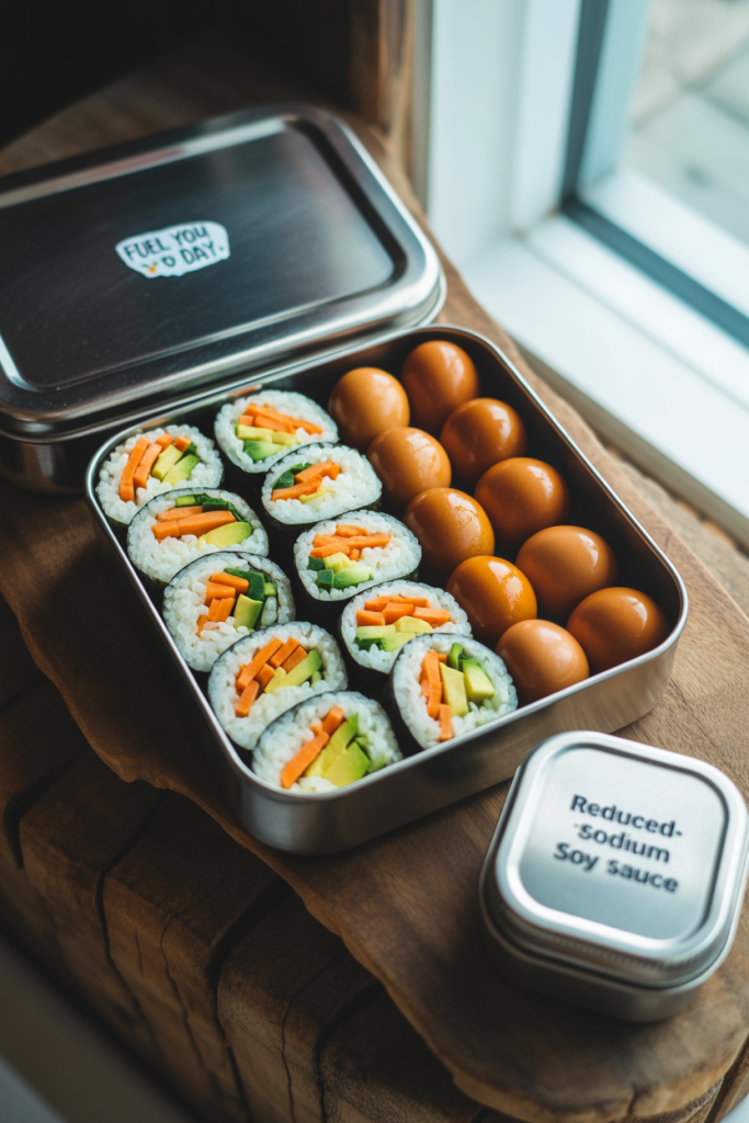 Veggie sushi rolls require no raw fish and stay fresh for days when wrapped tightly. Soy-marinated eggs add umami and extra protein. Dip in a small container of reduced-sodium soy sauce for full flavor.
