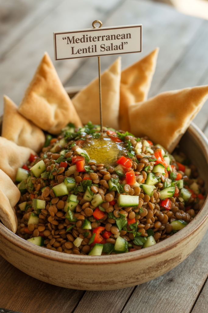 Brown lentils keep their shape after cooking, making them salad-friendly. Chopped veggies and a lemon-olive oil dressing add freshness. Pita triangles scoop the salad easily without utensils.