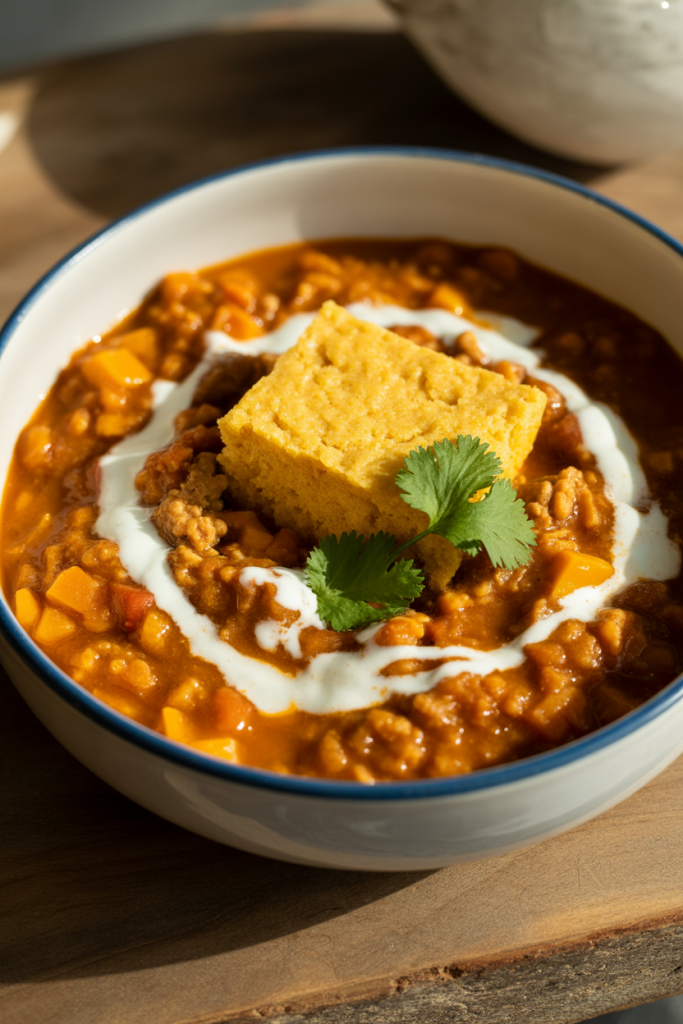 70. Pumpkin Chili, Cornbread Squares & Yogurt Drizzle