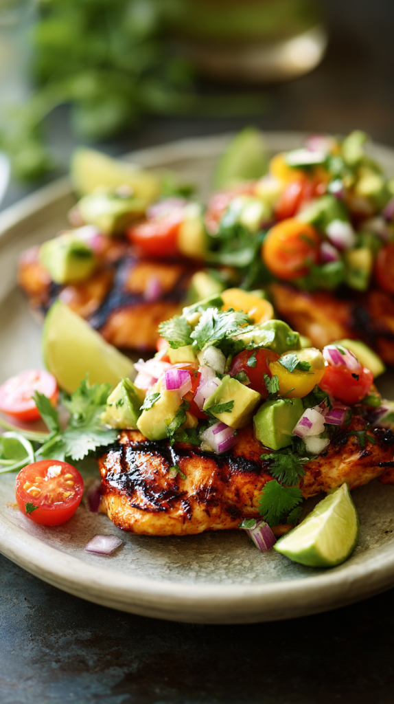 Grilled chicken marinated in a coconut-lime blend is topped with a fresh avocado salsa, creating a tropical, low-sodium dish that’s bursting with flavor and packed with heart-healthy ingredients. It’s a perfect balance of savory and refreshing!