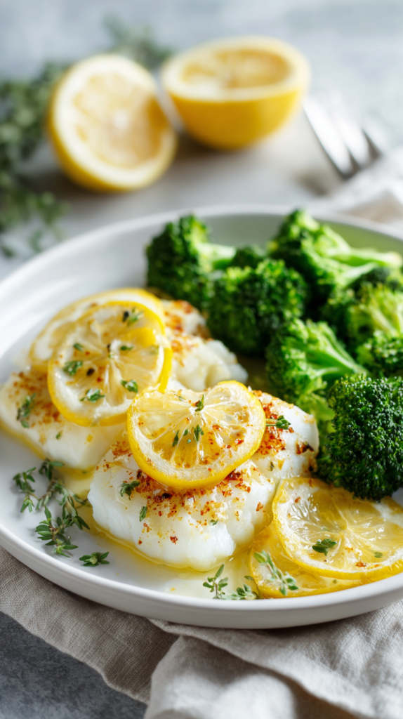 13. Lemon Garlic Cod with Steamed Broccoli