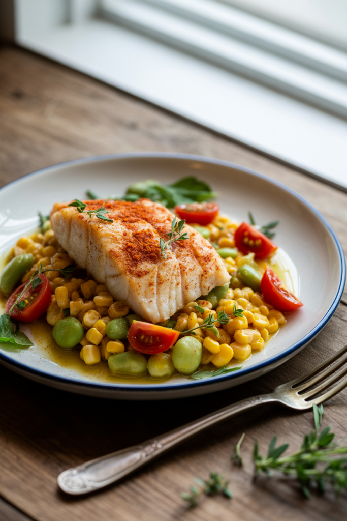 Lean cod fillets are dusted with smoked paprika and quickly seared for a flaky, flavor-packed main. A succotash of corn, lima beans, and cherry tomatoes provides seasonal color and fiber. Store fish and veggies separately for optimal texture, then reheat together.