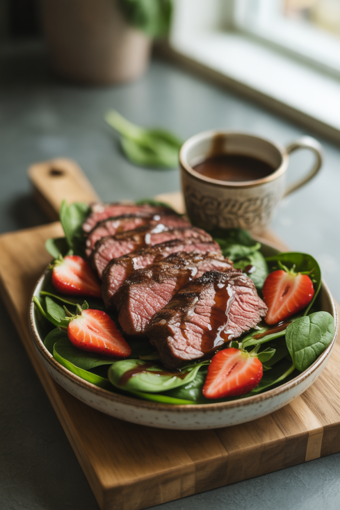 Flank steak is marinated in balsamic vinegar, grilled, and sliced thin while still juicy. Sweet strawberries brighten the hearty protein and add vitamin C. Include a small cup of balsamic vinaigrette for drizzling later.