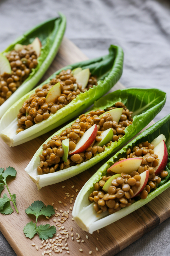 Cooked lentils absorb a mild curry powder dressing, offering 12 g of plant protein per scoop. Crisp apple pieces lend sweetness and crunch. Use sturdy romaine hearts so the boats hold up in lunchboxes.