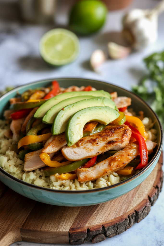 Lean turkey breast strips marinate in lime juice and garlic, then sear alongside bell peppers and onions. Cauliflower rice underneath soaks up the fajita juices with almost no extra calories. Add avocado slices just before serving for healthy fats.