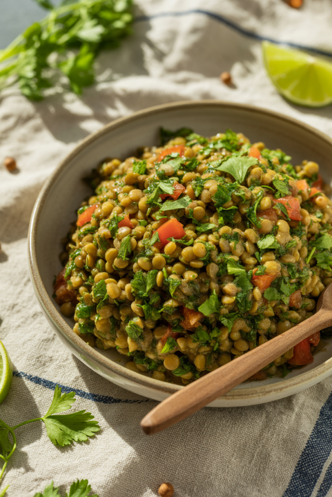 Swapping bulgur for lentils transforms tabbouleh into a protein powerhouse. Plenty of parsley and lime juice keep it bright and herbaceous. It’s even better on day two after the flavors meld.