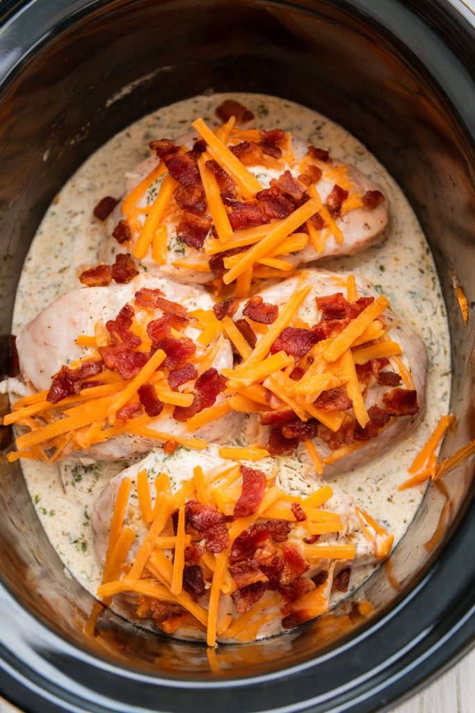 This crowd-pleasing dish is a guaranteed winner! Combine chicken breasts, bacon bits, ranch seasoning, and shredded cheddar cheese in a freezer bag. When ready to cook, dump the contents into your crockpot and cook on low for 6-8 hours. The chicken will be juicy and flavorful, and the cheesy bacon ranch topping will have you wanting more.