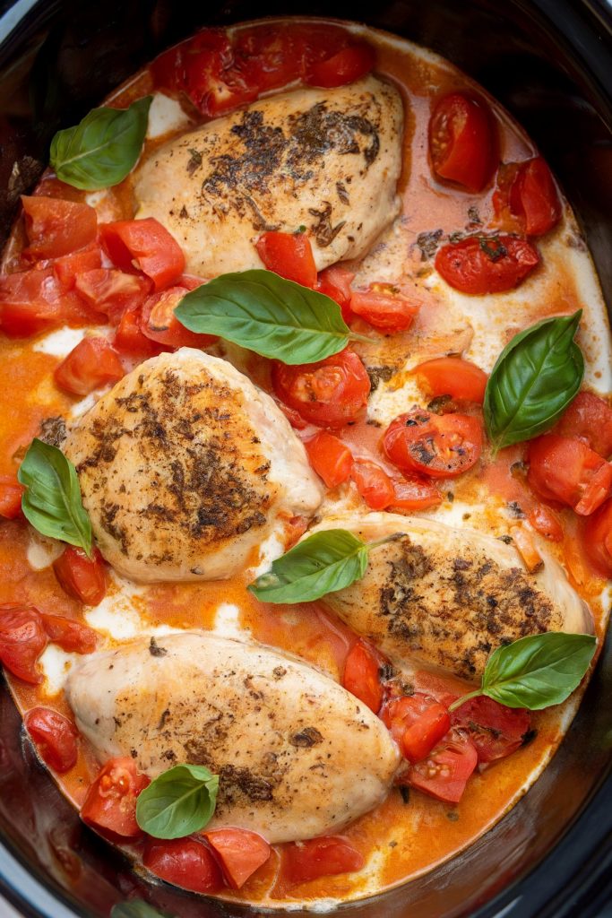 This Italian-inspired dish is both comforting and flavorful. Combine chicken breasts, diced tomatoes, fresh basil leaves, heavy cream, and a blend of garlic, onion powder, and oregano in a freezer bag. When ready to cook, dump the contents into your crockpot and cook on low for 6-8 hours. The chicken will be tender and bathed in a creamy tomato sauce.