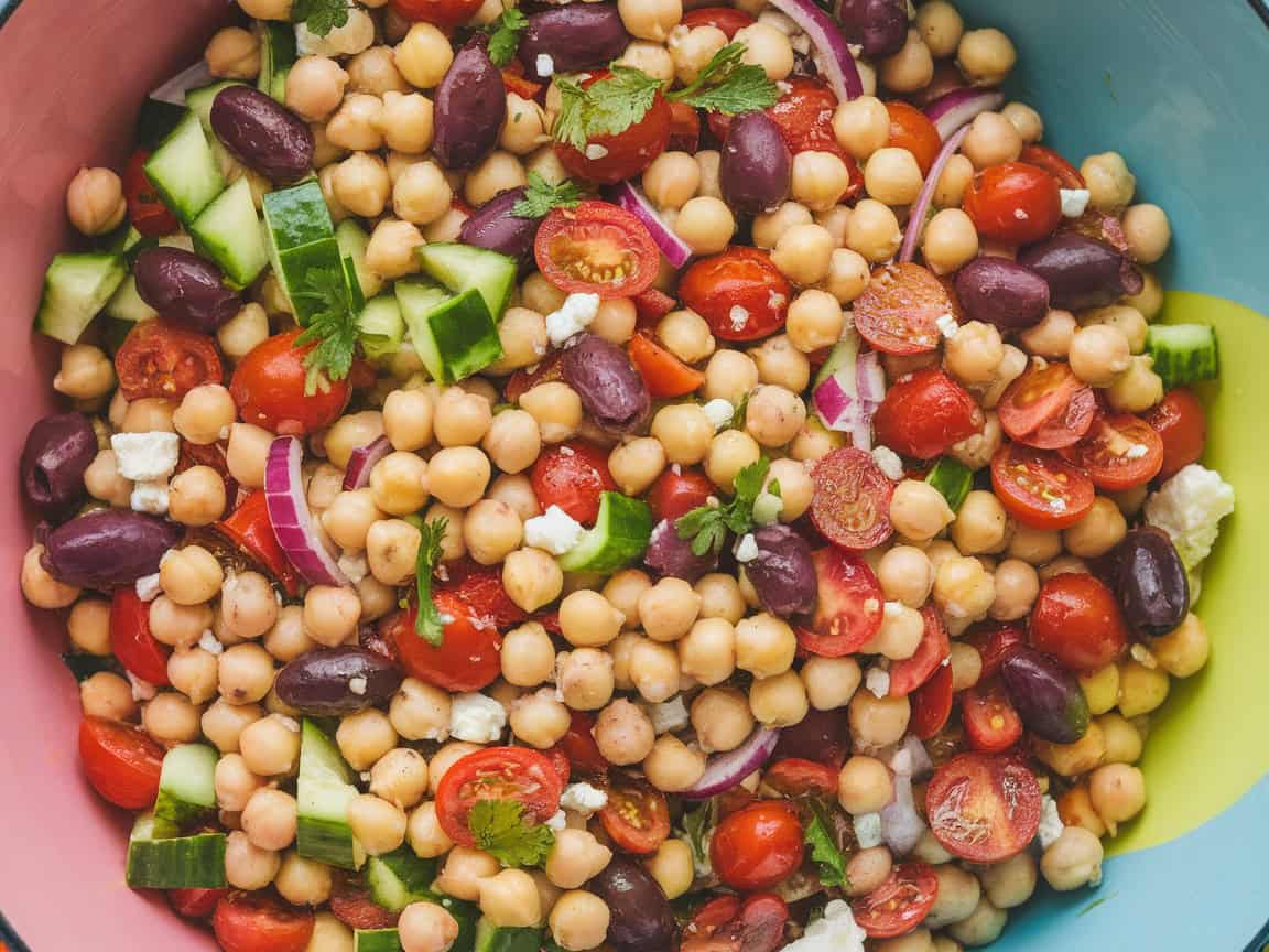 Next, add the diced red onion, crumbled feta (if you like some creamy tang), and sliced Kalamata olives. Gently stir in the chickpeas so that your bowl is brimming with robust color and texture. In a smaller bowl, whisk together the olive oil, lemon juice, red wine vinegar, dried oregano, salt, and pepper, allowing the flavors to meld into a bright, balanced dressing.