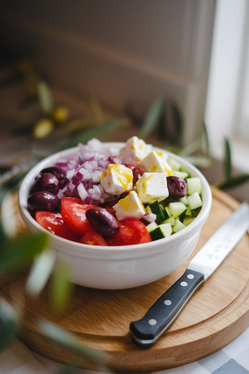 Bright vegetables, briny olives, and creamy feta deliver flavor without effort. Toss everything with a splash of extra-virgin olive oil, red-wine vinegar, and dried oregano. Add a handful of canned chickpeas for extra protein. Pack the dressing separately to keep the salad crisp until lunch.