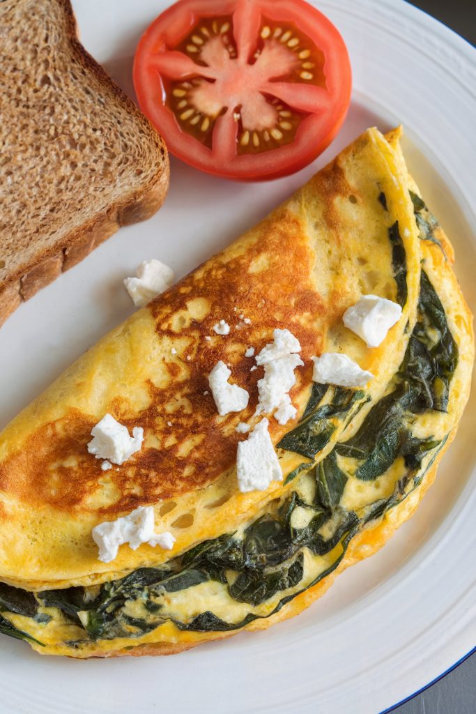 Whisk eggs with a splash of milk and sauté spinach with garlic in a pan. Pour the egg mixture into the pan and cook until the omelet is set. Sprinkle with feta cheese and fold in half. This omelet is a great source of protein and a perfect way to start your day. Serve with a side of whole-wheat toast and a slice of tomato.