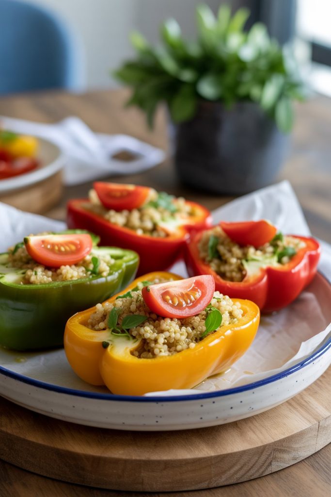 Cook quinoa in broth, then stir in basil pesto for herby depth. Spoon into bell peppers and bake until the peppers soften. The finished halves reheat flawlessly and even taste great at room temperature.