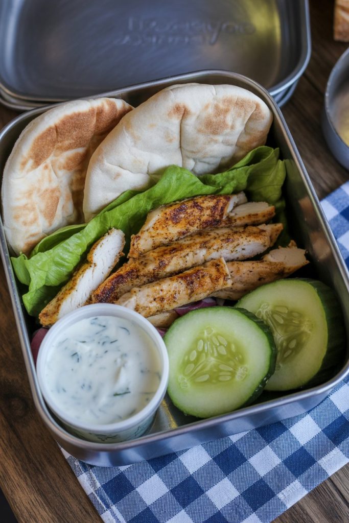 Cut pitas in half and layer lettuce at the bottom to prevent sogginess. Add cooled grilled chicken, cucumber, and a drizzle of tzatziki just before eating. Everything stays fresh for up to three days.