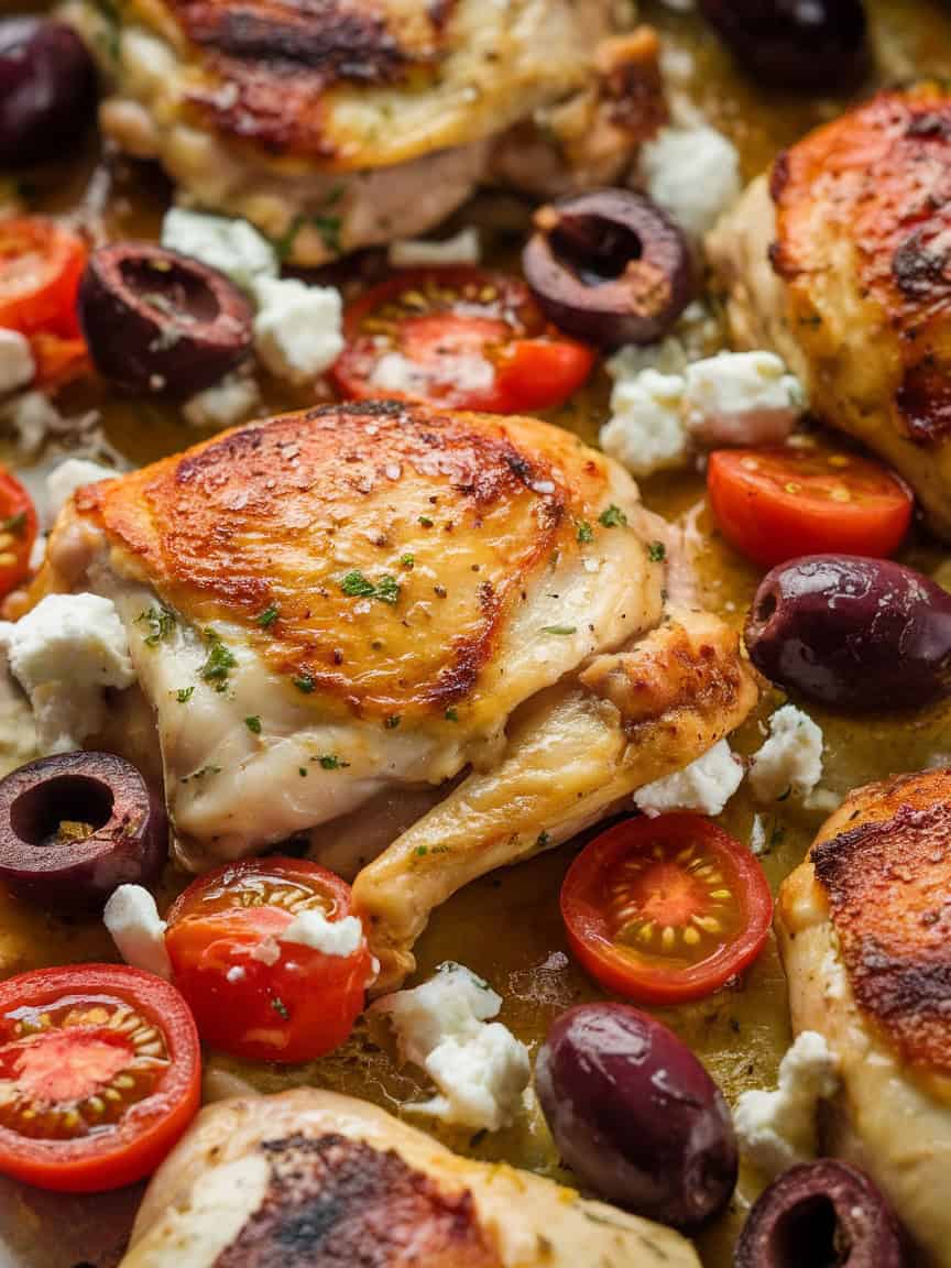 Elevate your weeknight menu with this easy, flavor-packed chicken bake. Balanced by bright lemons, tangy olives, and aromatic herbs, it delivers a Mediterranean getaway right from your own kitchen. Get ready to fall for its juicy chicken thighs, fresh bursts of tomato, and savory feta on top.