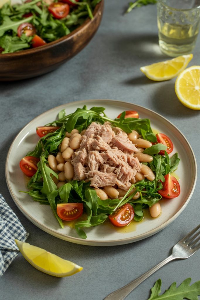 Cannellini beans provide creamy texture and extra protein to stretch one can of tuna further. Arugula’s slight bite brightens the mix without heavy sauces. Lemon and olive oil keep the flavors fresh and heart-friendly. Serve with whole-grain toast for additional complex carbs.