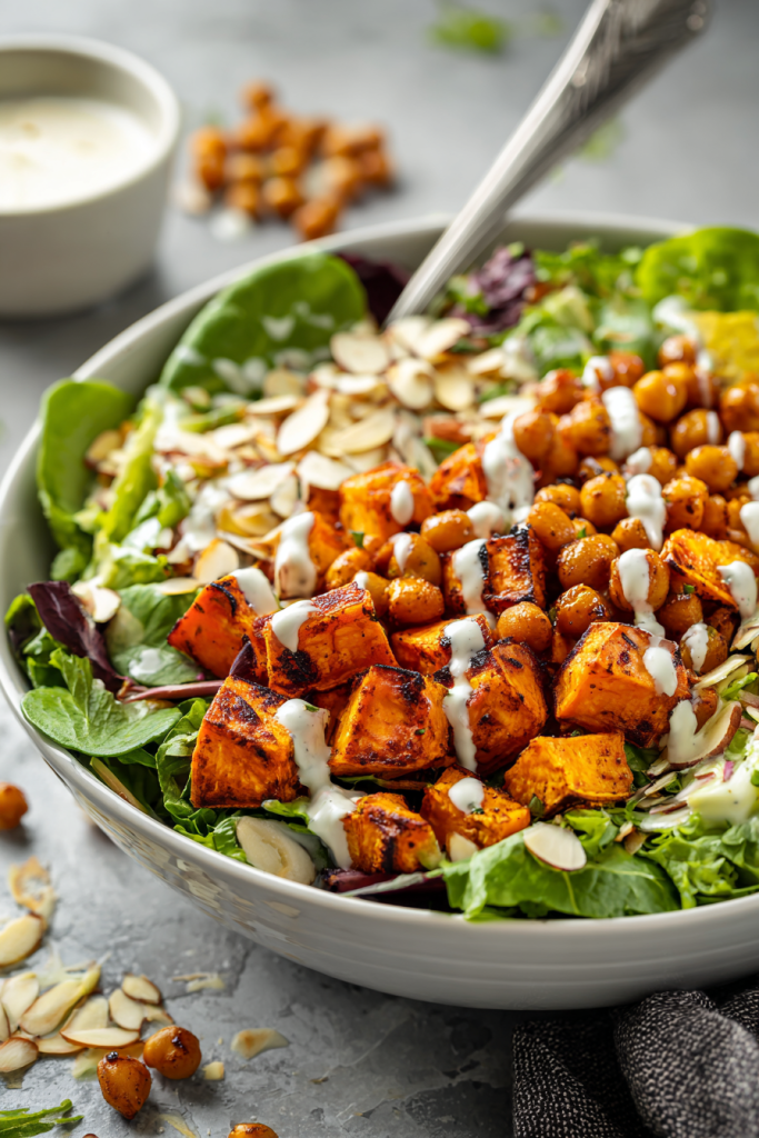 - 30. Sweet Potato, Chickpea & Almond Salad with Cinnamon Yogurt Dressing