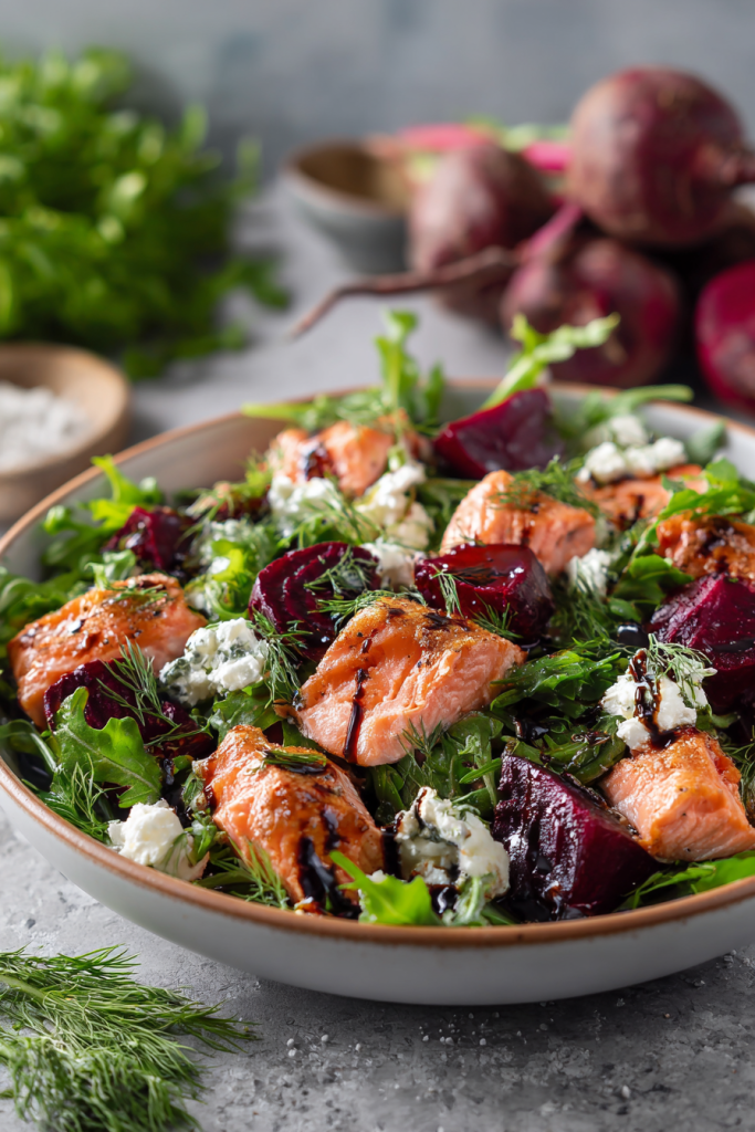 Creamy ricotta adds a protein boost and mild flavor that complements earthy beets. Pistachios sprinkle in crunch and healthy fats. A touch of balsamic brings gentle sweetness.
