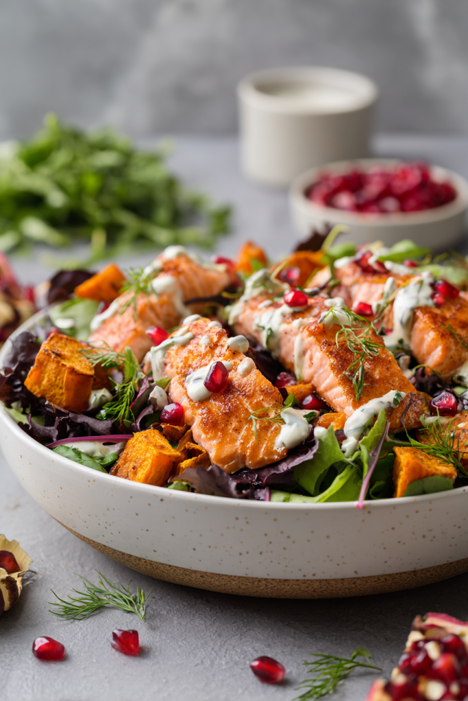 Roast salmon turns classic potato salad into a protein-forward entrée. Capers and dill bring briny freshness that cuts through the creamy yogurt dressing. Serve slightly warm or chilled.